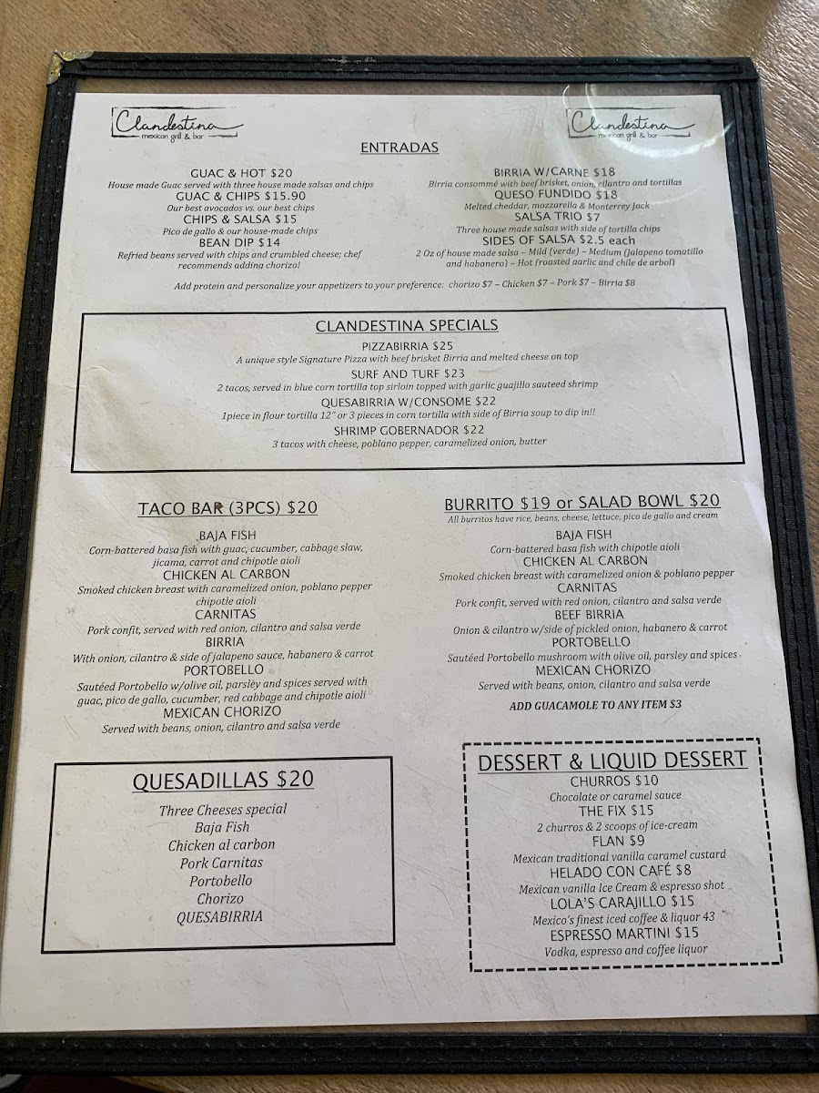 With comfortable seating and a welcoming ambiance, Clandestina Mexican Grill & Bar invites you to immerse yourself in a feast that feels both upscale and homely. Whether sharing tacos with friends or indulging in a quiet dinner on the patio, every visit promises to be a celebration of Mexican heritage and flavors.